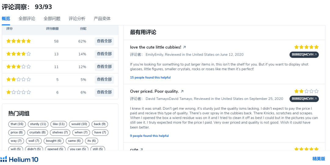 在单个产品页面,运行插件中的“Review Insights”,插件将为您自动识别出评论评分、热门词组,以及最有用的评论。
