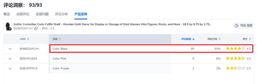 在产品变体部分展示不同变体Review数量,以及变体的占比和评分。根据这些信息,我们可以快速判断出最受欢迎的产品颜色及尺寸。