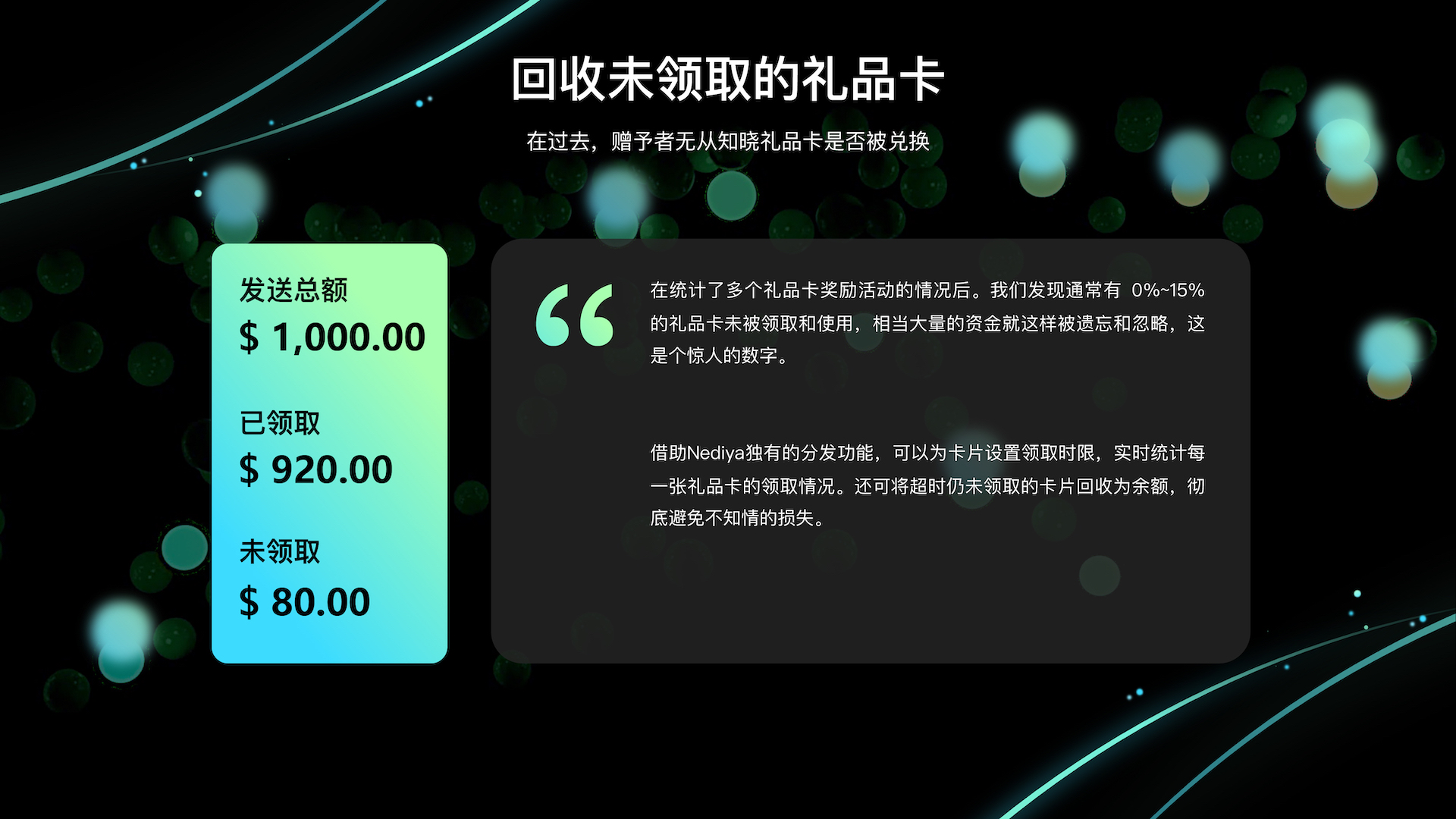 Nediya提供礼品卡发送与管理工具,支持实时追踪每张礼品卡的领取状态,帮助您精准判断礼品卡是否被领取。对于未被领取的卡片,系统支持回收功能,有效避免成本浪费。